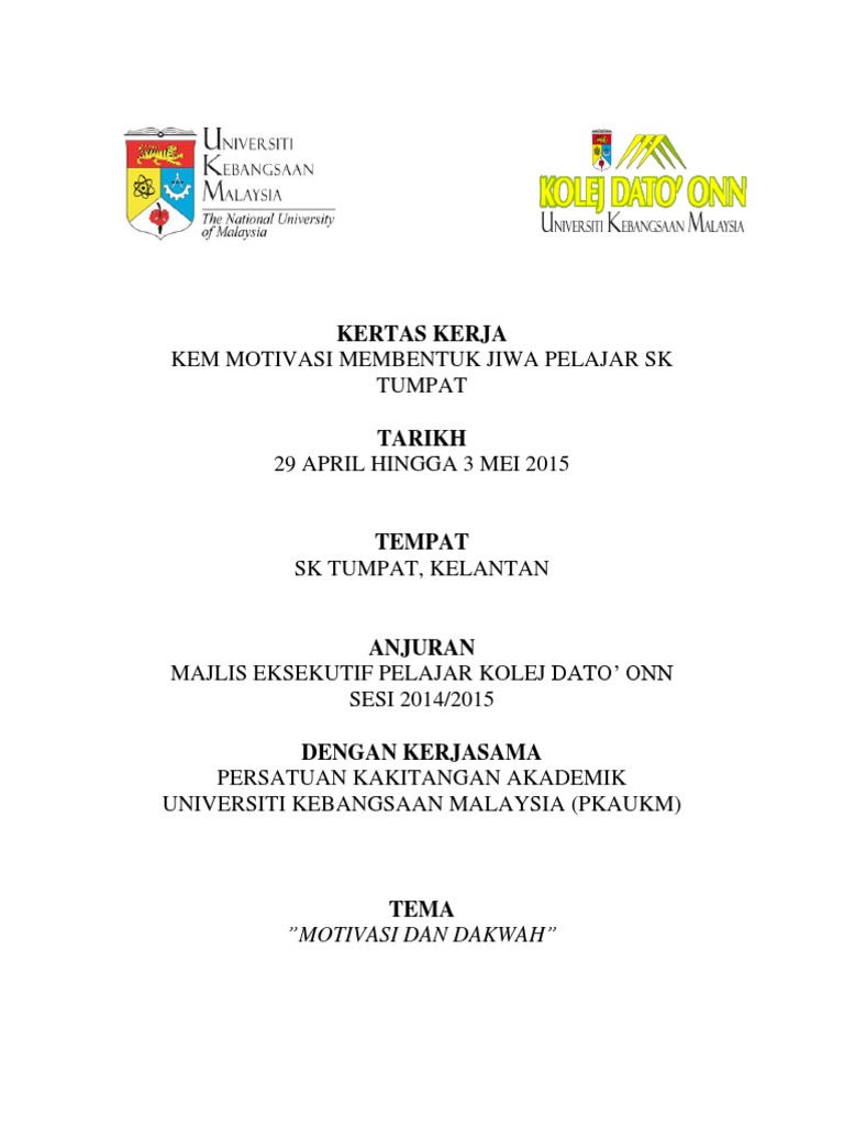 Ahli jawatankuasa kecermerlangan upsr 2012 1.0 tujuan kertas kerja ini dikemukakan untuk membawa murid murid menjelang upsr agar lebih. Peranan dan sumbangannya dalam ketamadunan islam muhammad arif yahya & latifah kertas kerja. Kertas kerja kem pemantapan sahsiah murid. Kertas kerja kem jati diri (pelajar berisiko). Kertas kerja kem pengawas 2013 by emymastura 14645 views. Mang saje outdoor 8 months ago. Kem jati diri guru smkttdi smk taman tun dr ismail. 4.0 tema pelajar proaktif pemangkin kebitaraan. Kertas kerja program peningkatan akademik. Kem yang dijalankan selama 3h2m. Dunia kerja produktivitas tips karier. Kertas kerja kelas tambahan sabtu. Kertas kerja kursus kepimpinan kokurikulum.