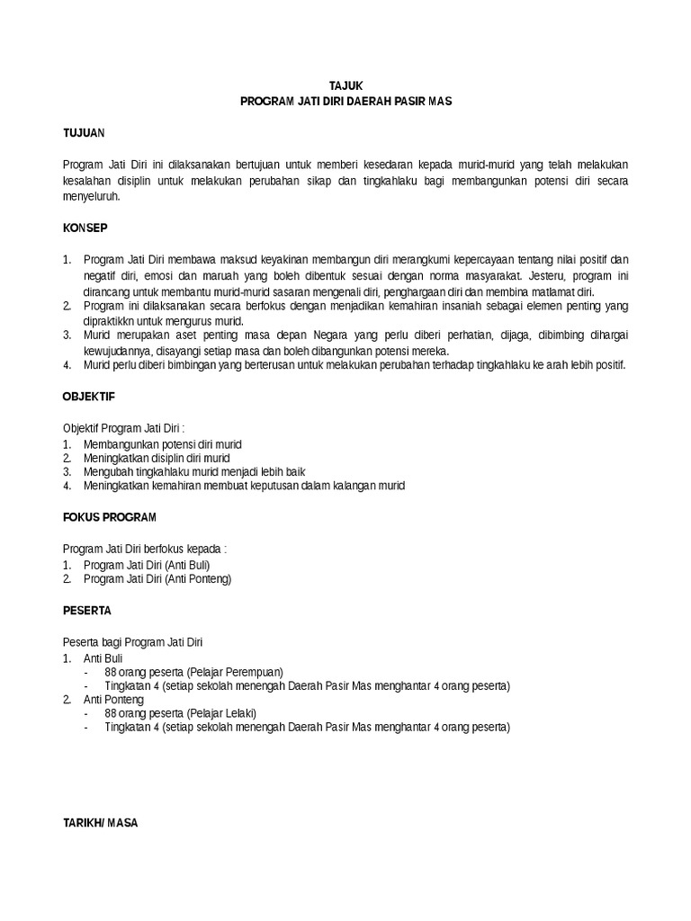 Kertas Kerja Kem Jati Diri - Selain itu, diharapkan peserta yang mengikuti pelatihan tersebut dapat termotivasi dan membuka usaha sendiri.. Kertas kerja kem jati diri ( pelajar berisiko ) 2013.doc. Menyimpan energi yang lebih untuk apa? Kem jati diri asrama 1 malaysia anjuran wirajaya excellence consultancy. Kem yang dijalankan selama 3h2m. Kem jati diri 2015 peringkat wilayah persekutuan kuala lumpur.