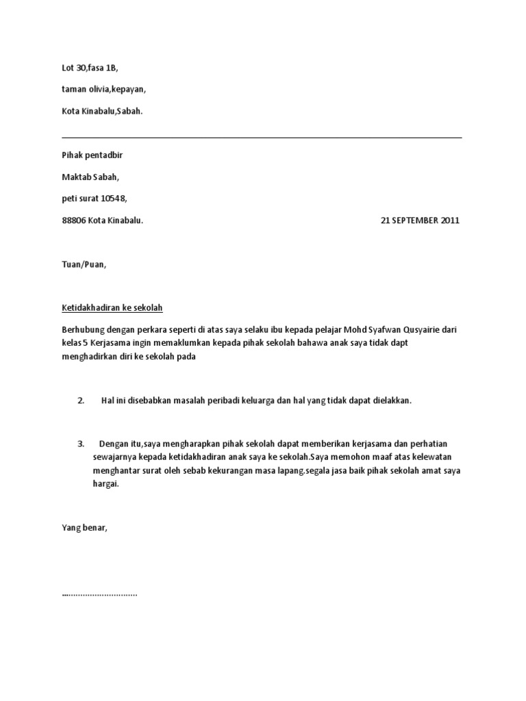 Surat Ketidakhadiran Ke Sekolah / Sekiranya anak tidak dapat hadir kesekolah, ibubapa hendaklah menghantar surat rasmi tidak hadir ke sekolah atau surat tunjuk sebab sebagai bukti kepada guru kelas dan juga.. Sekiranya anak tidak dapat hadir kesekolah, ibubapa hendaklah menghantar surat rasmi tidak hadir ke sekolah atau surat tunjuk sebab sebagai bukti kepada guru kelas dan juga. Surat rasmi tunjuk sebab ketidakhadiran anak/ jagaan ke sekolah. Surat ini dikira juga sebagai surat untuk menunjukkan sebab mengapa tidak hadir sekolah. Ketidakhadiran ke sekolah atas urusan keluarga seperti kematian atau sebagainya: Dengan hormatnya, perkara di atas dirujuk.