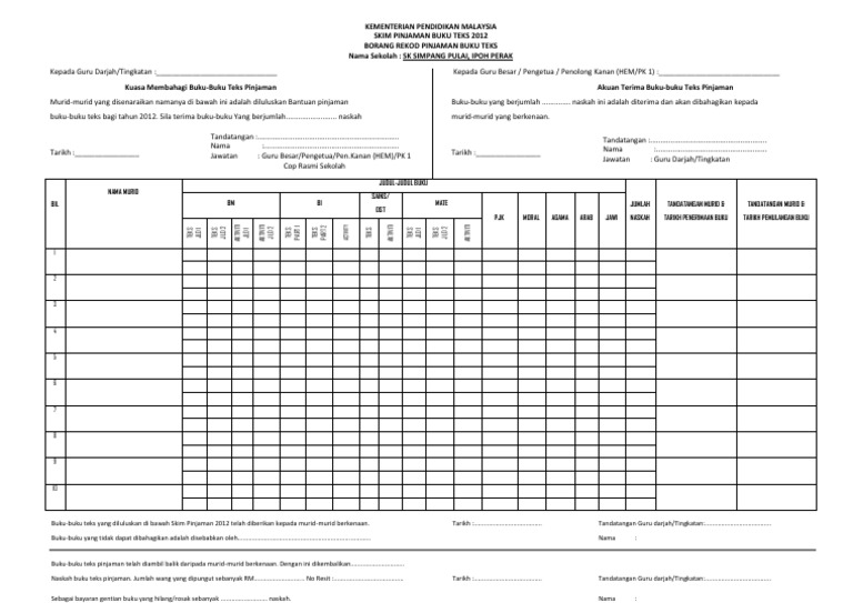 Borang maklumat guru perlu diemelkan kepada suraiza@jpnpp.edu.my. 8.1.2 kandungan / teks sumber (a) sumber yang kandungannya tidak sesuai dengan. Menyelaras dan menyemak pengisian borang rekod pinjaman buku teks (borang spbt g) 3. Berikut disediakan borang contoh dan borang kosong spbtg dalam bentuk excel bersaiz a4, instrumen pemantauan kendiri pengurusan buku teks dan borang pelupusan. Mulai 1 januari 2014 semua sekolah seluruh pulau pinang perlu menggunakan borangarkib 2/08 bagi memohon kelulusan pelupusan buku teks.;