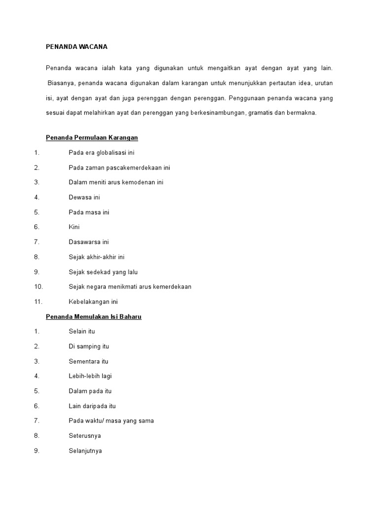 Penanda Wacana Untuk Rumusan : Bahasa melayu Sem 3 F6 (wacana) : 7) gunakan penanda wacana untuk menggabungkan setiap ayat.. I) penanda wacana untuk memulakan karangan. Kesimpulannya, untuk menulis sebuah wacana yang utuh, seseorang perlulah mengambil kira aspek semantik, leksikal, gramatikal dan fonologi. Huruf dibuat untuk mengganti peran bunyi. Pada era globalisasi ini, 2. (a) untuk menunjukkan maksud tambahan;